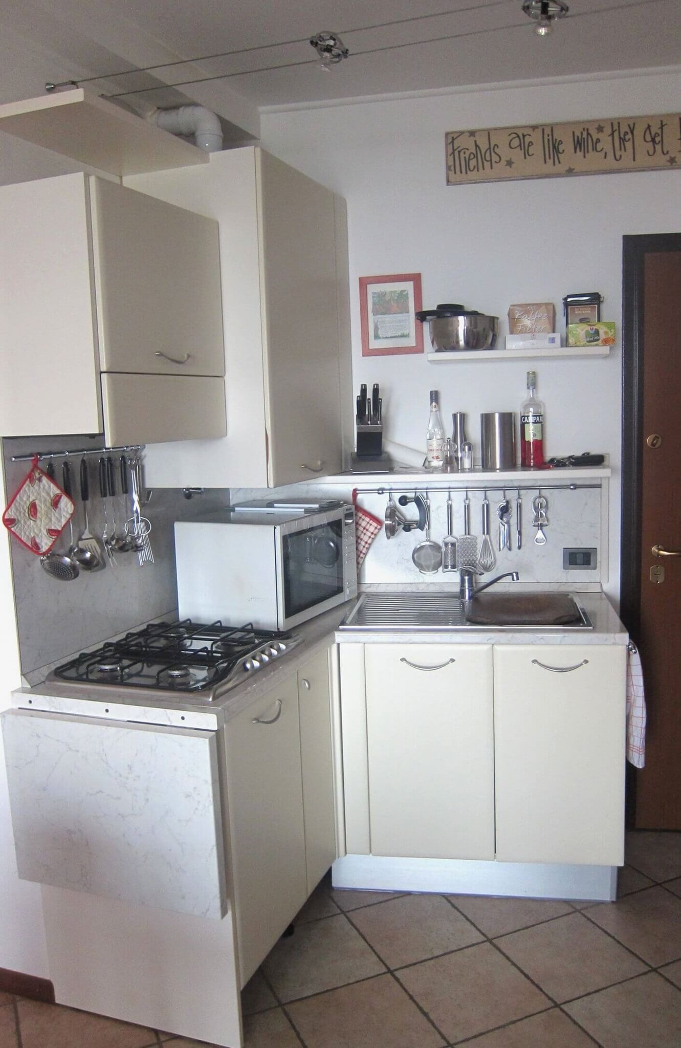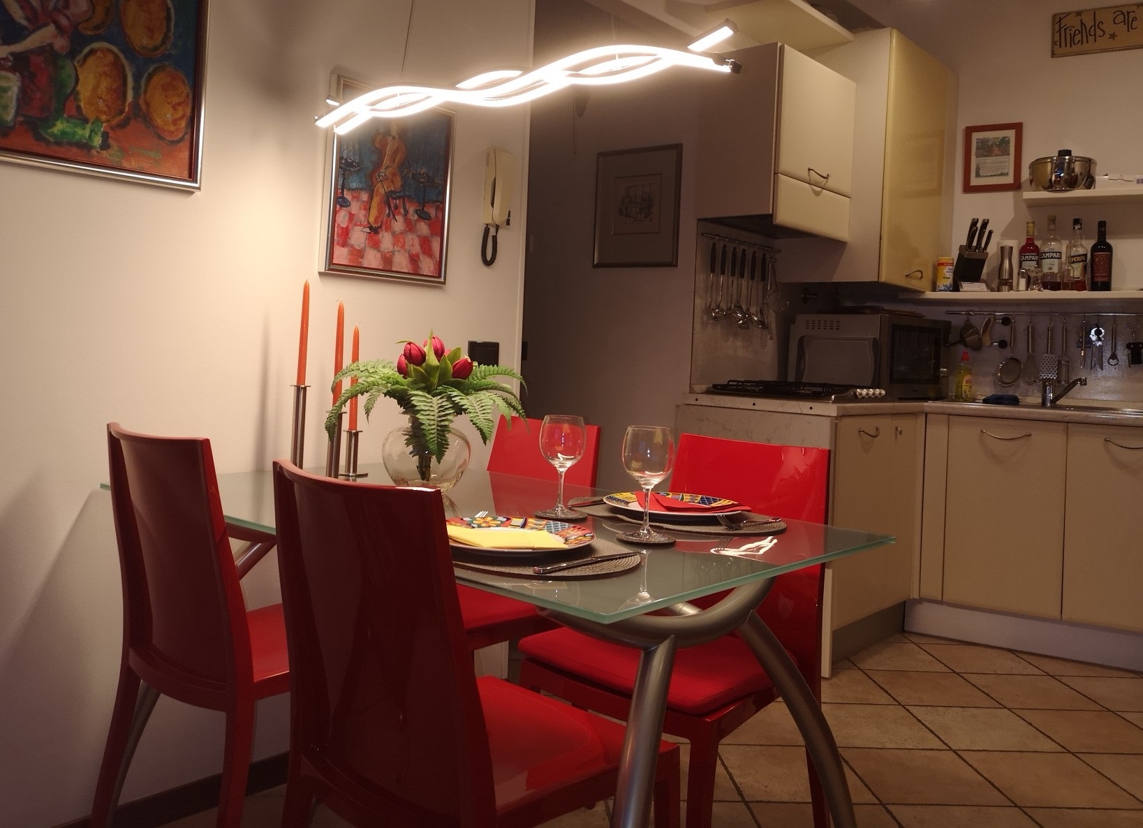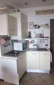 Am Eingang befindet sich eine Kochecke mit Klapparbeitstisch, 4-flammigem Gasherd, Dunstabzugshaube, Panasonic Kombigerät Microwelle / Ofen, Bosch Spülmaschine, NARDI Kühl- Gefrierkombination, WMF Töpfe und Pfannen, Küchenutensilien.