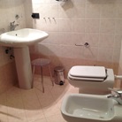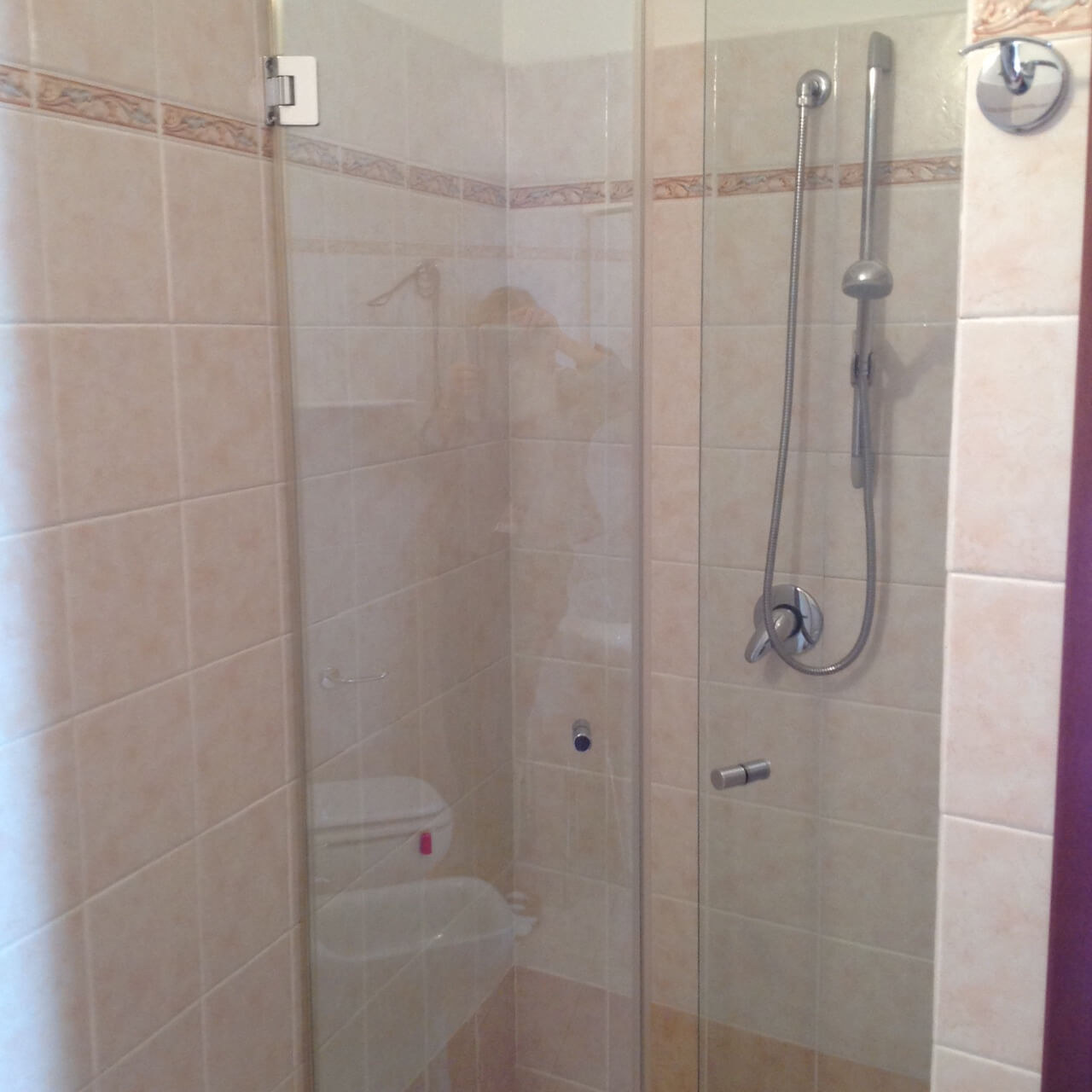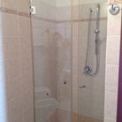 Duschkabine mit Kristallflügeltüren, Waschbecken und Spiegelschrank, Fön, Toilette, Bidet,
