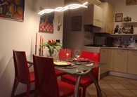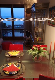 Dann der Essbereich: ein Calligaris Esstisch mit Glasplatte, 4 Bonaldo Kunststoffstühle und ein rotes Sideboard für Bestecke, Kochlöffel, Sets, Glasuntersetzer.