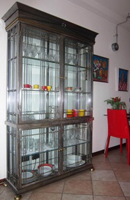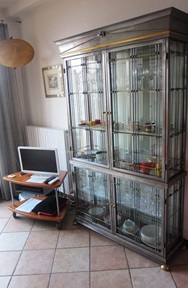 An der gegenüber liegenden Wand befindet sich ein Fernsehtisch, darauf SAT-TV deutsche Sender und ein kleiner CD-Player mit Radio. Kein W-Lan. Eine italienische ORLANDI Designer Vitrine mit Zinn- und Messingverstrebungen beinhaltet Geschirr, Gläser, Karaffen usw.